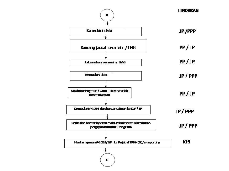 Pada akhir bulan, kumpulkan maklumat dari PG 201 dan sediakan reten PG 203 , PG 204 untuk sekolah rendah / menengah dan hantar secara e-reporting HMIS ke Pangkalan idsapp.moh.gov.my satu salinan hardcopy kepada Pejabat TPKN. |