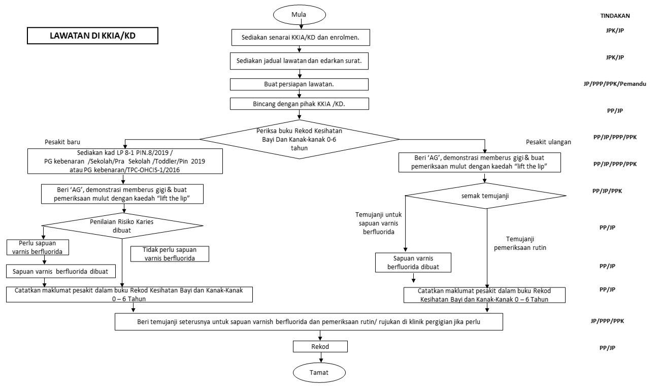 Sapu varnis fluorida jika perlu dan rekod dalam kad LP8-1 PIN.8/2019 /secara online dalam sistem TPC-OHCIS. Rujuk PKPNS-AK4 Sapuan Varnish Berfluorida.